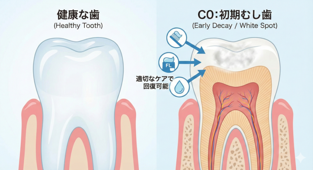 - C0: 歯の表面が少し白濁している(要観察)