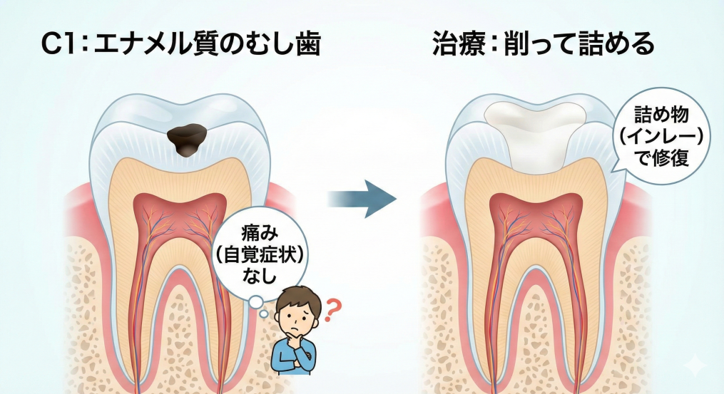 - C1: エナメル質に小さな穴(痛みなし)