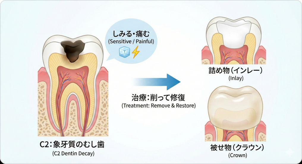 - C2: 象牙質まで進行(しみる・痛み)