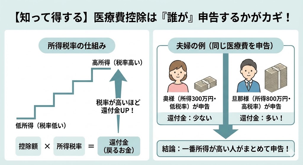 医療費控除は、「所得税率が高い人(=年収が高い人)」が申告したほうが、戻ってくる税金が多くなるという仕組みになっています。