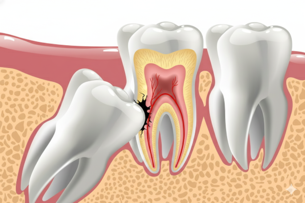 • 隣接歯(第二大臼歯)の虫歯・歯周病: 手前の健康な奥歯との間に深い隙間を作り、そこが虫歯になります。最悪の場合、親知らずだけでなく、手前の重要な奥歯まで抜歯せざるを得なくなることがあります。