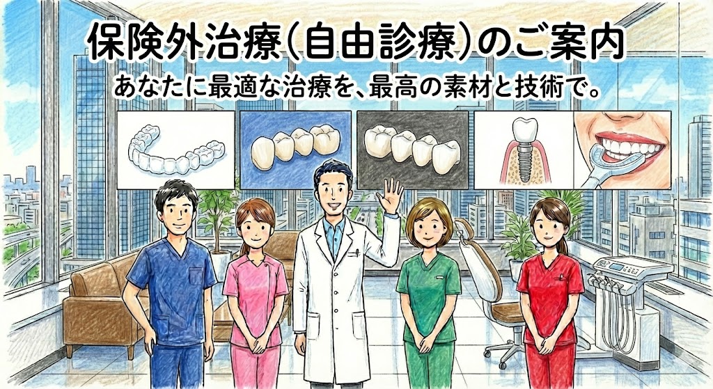 保険適用外(自費診療)の主な治療一覧です。 自費診療は「見た目の美しさ(天然歯に近い)」と「長持ち(適合が良い)」が最大の特徴です。医院によって価格は異なります。