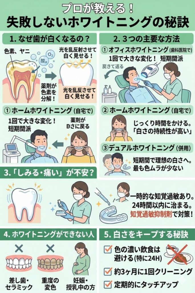 A. ホワイトニングの効果は永久ではありません。 一般的には半年〜1年ほどで少しずつ色が戻り始めます(後戻り)。白い状態を長く維持するためには、3ヶ月〜半年に一度の「タッチアップ(追加のホワイトニング)」や、歯科医院での定期的なクリーニングが非常に効果的です。