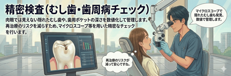 肉眼では見えない隠れたむし歯や、歯周ポケットの深さを数値化して管理します。再治療のリスクを減らすため、マイクロスコープ等を用いた精密なチェックを行います。