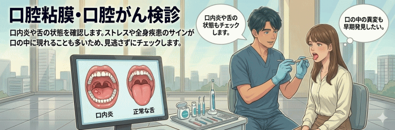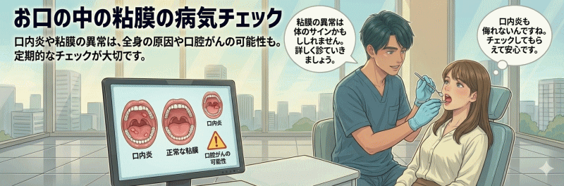お口の中や舌、唇、口角などの粘膜にできる炎症(口内炎)には、お口の中やその周りに原因があるものと、全身的な原因があるものとがあります。また、口腔粘膜の異常は、口腔がんなどの病気の可能性もあります。普段からお口の中を清潔に保つとともに、定期的に歯医者さんでお口の中の粘膜の状態をチェックしてもらいましょう。