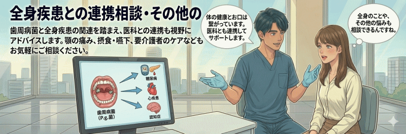 歯周病菌(P.g.菌)と糖尿病、心疾患、認知症などの関連性を踏まえ、必要に応じて医科との連携を視野に入れたアドバイスを行います。