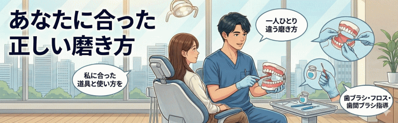 歯と歯ぐきの正しい磨き方は、その人の歯並びや歯磨きの癖などのため、一人ひとり違うものです。あなたに合った、歯ブラシ・フロス・歯間ブラシなどの正しい使い方を、歯医者さんに教わりましょう。