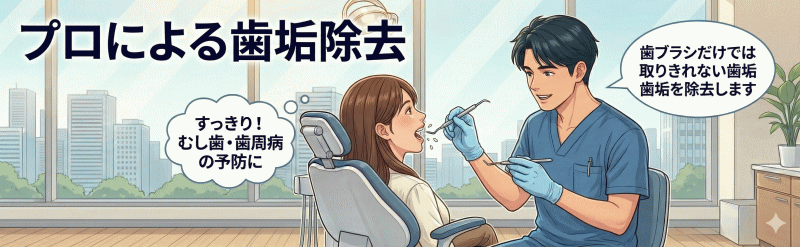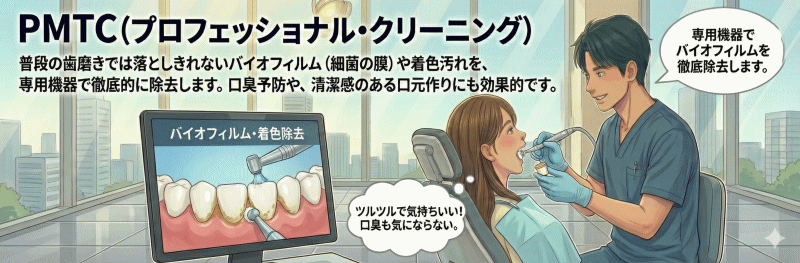 普段の歯磨きでは落としきれないバイオフィルム(細菌の膜)や着色汚れを、専用機器で徹底的に除去します。口臭予防や、清潔感のある口元作りにも効果的です。