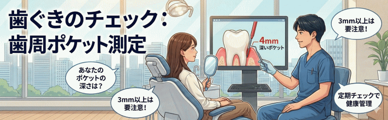 歯のまわりのポケット(歯周ポケット)が深いと、歯周病になります。あなたの歯周ポケットの深さはどのくらいか、チェックしてもらいましょう。